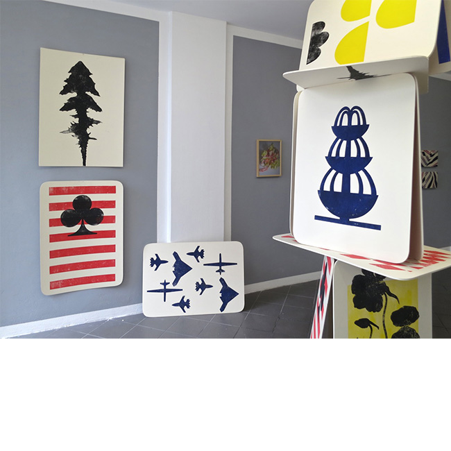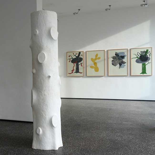 Gips / 220 x 50 x 50 cm und Linolschnitte 100 x 70 cm / Ausstellungsansicht : Schlaraffenland Galerie Artoxin München