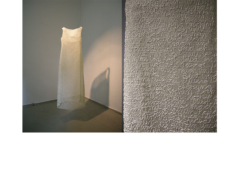 Auf der tragbaren Skulptur ist die tragische Geschichte der Großtante der Künstlerin zu lesen, die Ihren Bräutigam einen Tag vor der Hochzeit bei einem Flugunglück verlor und aufgrund dieses Ereignisses langsam selbst der Welt entrückte.