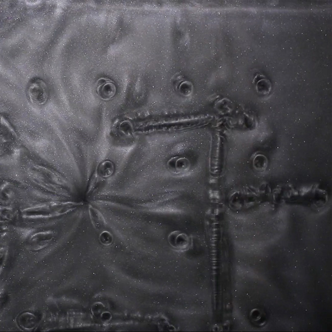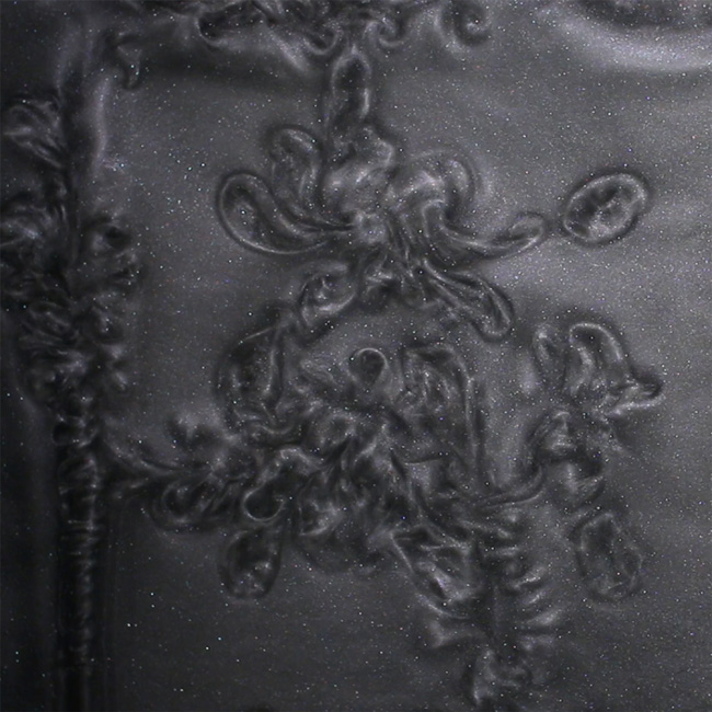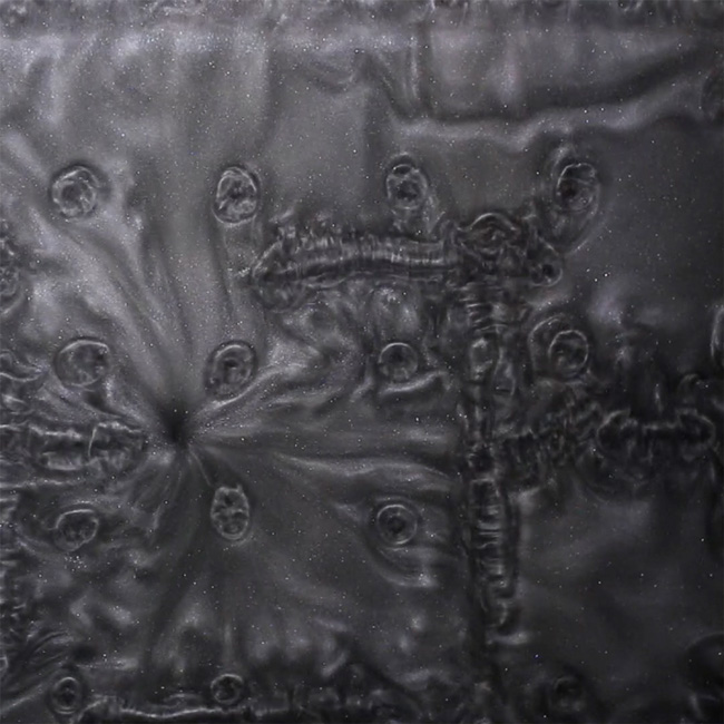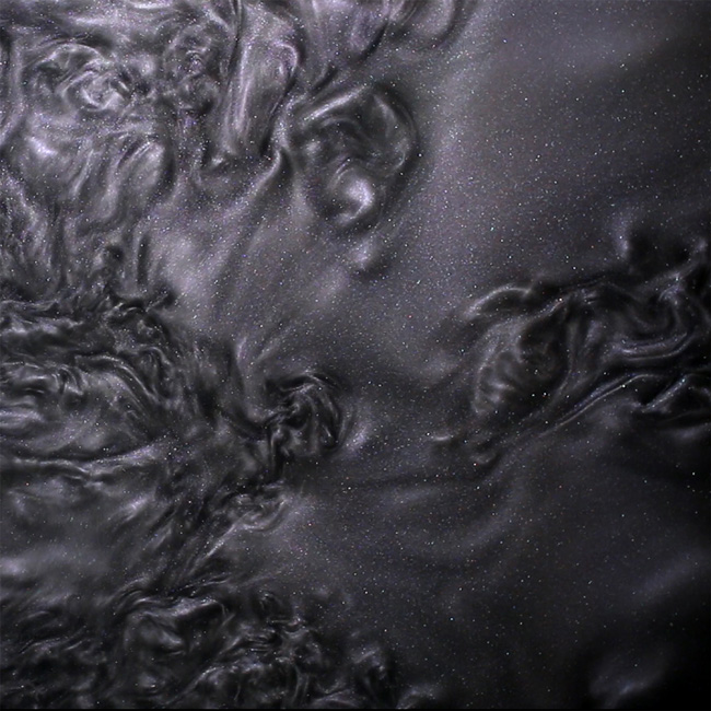 Die glitzernde, schimmernde Flüssigkeit innerhalb des Kubus wird gezielt in Bewegung versetzt,