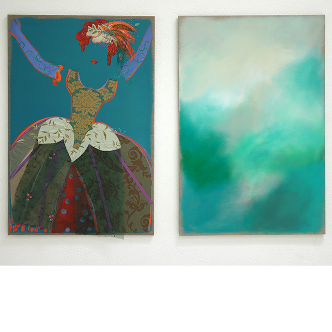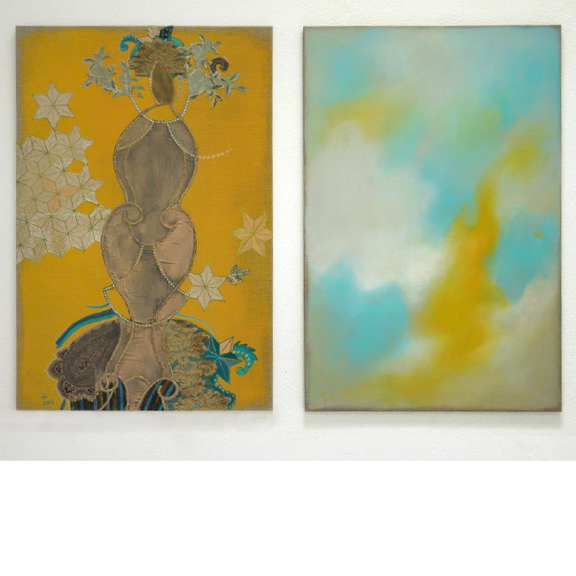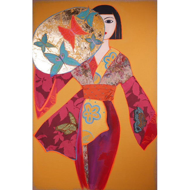 Acryl, Blattgold, Seide und andere Stoffe auf Leinwand